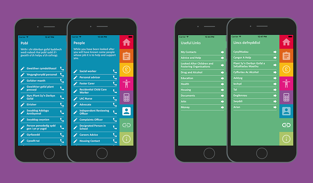 The application featured an address book to allow quick access to user entered telephone numbers of carers and administrator updated governing bodies. It also features a budget calculator for young adults to enter their weekly outgoings.